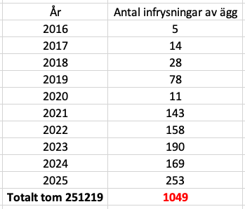 Antal patienter som fryst in sina ägg hos oss sedan år 2016.